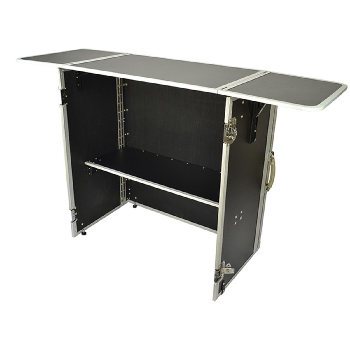 Our new Flight Zone collapsible table stand is the perfect companion piece for the DJ who likes to go completely modular. Use it for a home studio set up or on stage. Showing off your gear and talent never looked better with our foldout table stand. Made of black laminate and aluminum valance edging, this stand provides a clean professional appearance, and it's easy to set up or tear down.Folded Dims: 33.25"w X 36.5"h X 4.25"dOpen Dims:54"w X 37"h X 19.5"dOdyssey FZF5437T Portable Folding DJ Table StandOur new Flight Zone collapsible table stand is the perfect companion piece for the DJ who likes to go completely modular. Use it for a home studio set up or on stage. Showing off your gear and talent never looked better with our foldout table stand. Made of black laminate and aluminum valance edging,