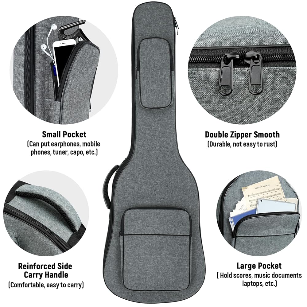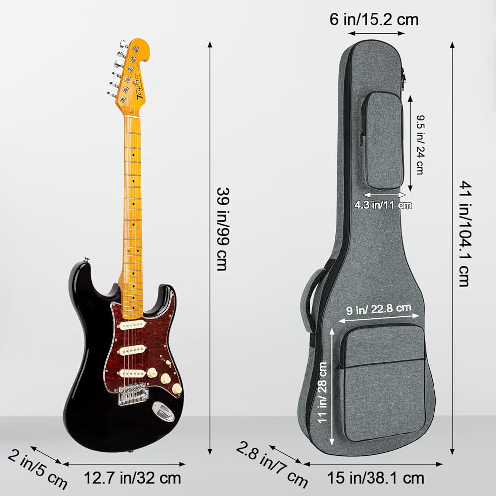 Lightweight Portable Gig Bag for Electric Guitars: Bag dimension 40.9”x15.5”x2.7”, upper bout 11.8”, lower bout 14.7”, fits for 40 inch Electric Guitars. NOTE: THIS GIG BAG IS TOO SHORT FOR AN ELECTRIC BASS GUITAR. Please select from electric bass guitar bags in our store if you need.Back Loop Handle: There is a loop handle on the back of the guitar bag, which can be hung on the wall when not in use. Keep your guitar bag clean and save space.There is a loop handle on the back of the guitar bag, which can be hung on the wall when not in use. Keep your guitar bag clean and save space. 43.5 x 4.7 x 17.7 inch, compatible with 39/40/41 inch guitars.