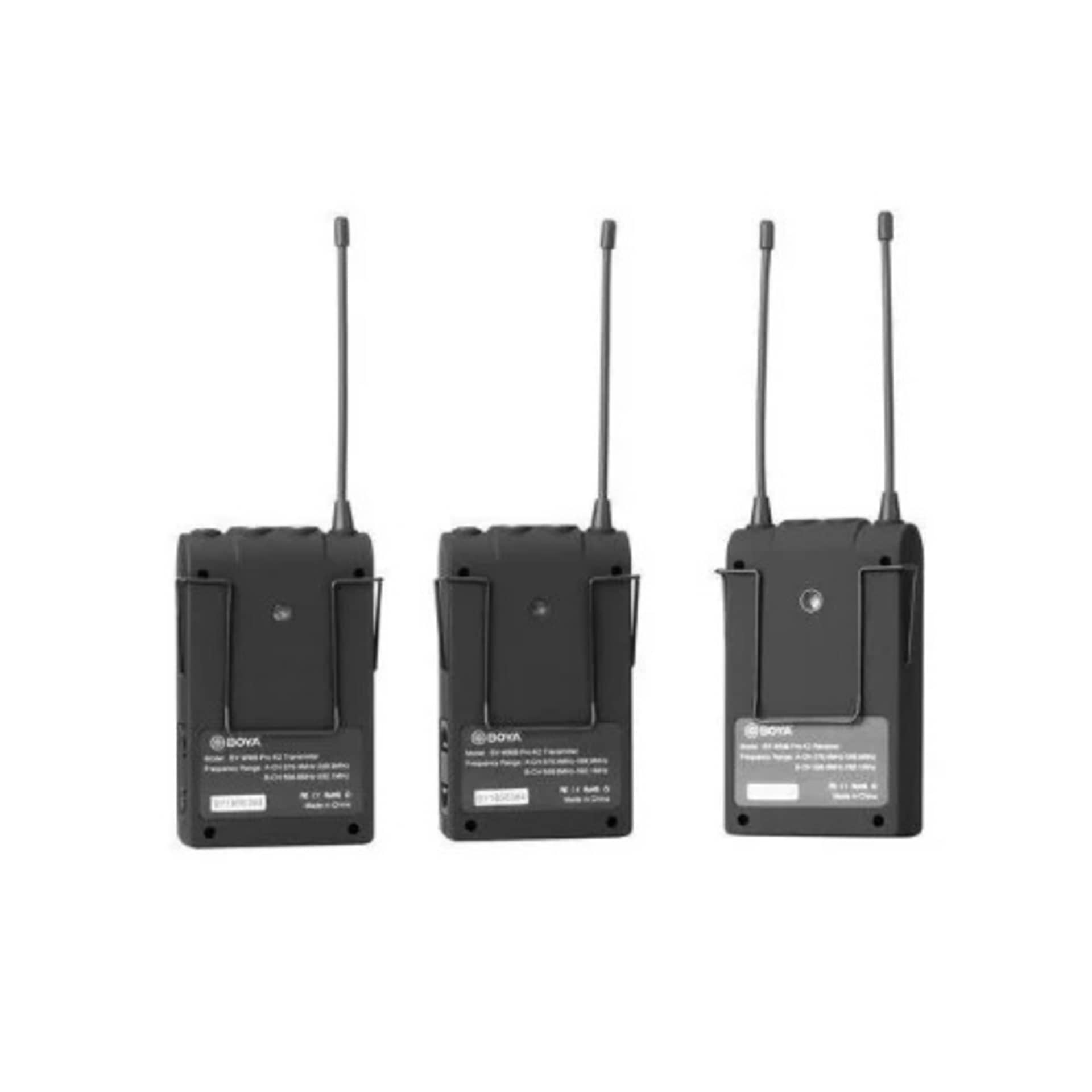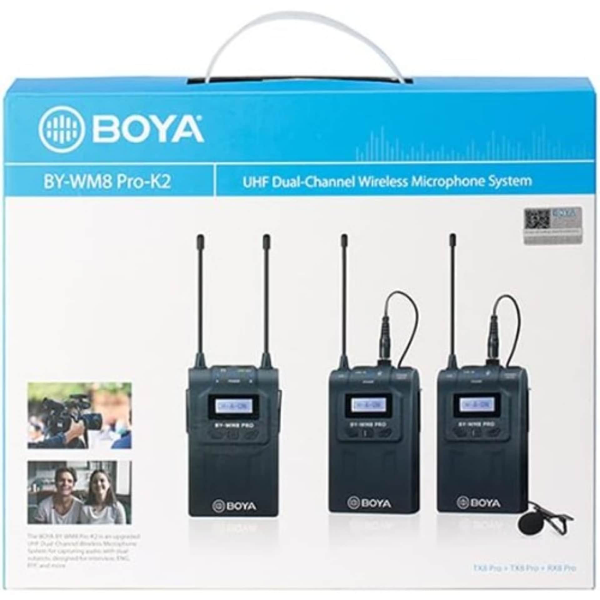 The BY-WM8 Pro-K2 is an upgraded UHF Dual-Channel Wireless Microphone System for capturing audio with dual subjects, features an easy-to-read LCD display, a wide switching RF bandwidth, PLL-synthesized tuning, and digital companding circuitry.